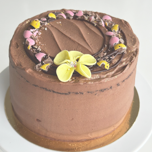 Suklaapohjien välissä aprikoosihilloa ja suklaakreemiä. Päällä suklaakreemiä ja koristelu pääsiäiseen sopivasti. Kakku on maitotuotteiden osalta laktoositon, mutta suklaa ei ole laktoositonta.